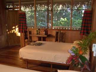 The main lodge and all the cabins are built up above the jungle floor and connected by boardwalks. Each cabin is designed for maximum privacy. All have ceiling fans (no A/C) and a dry box to keep electronics protected from the 90 percent humidity. We step out onto our covered porch and are greeted by a procession of spider monkeys crashing by. They appear to follow each other from branch to branch -- a monkey highway in the trees!