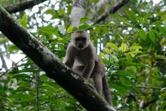 Sacha Lodge can only be reached by water. We travel on a long, narrow shallow-draft boat. Bob and I are very comfortable on the cushioned seat with a row to ourselves. The breeze tempers the heat that radiates from the Napa River banks, and soon we get our first glimpses of the rainforest habitat. For most of the trip we see no more than an occasional dugout canoe and perhaps a cut trail leading to an isolated dwelling. To reach the lodge we disembark and walk inland about 25 minutes along a raised boardwalk to the edge of a lake. There we climb into a canoe paddled by a Sacha guide to cross to the lodge. The water is very dark, rich in tannins from decomposing vegetation. We have found remote!The main lodge and all the cabins are built up above the jungle floor and connected by boardwalks. Each cabin is designed for maximum privacy. All have ceiling fans (no A/C) and a dry box to keep electronics protected from the 90 percent humidity. We step out onto our covered porch and are greeted by a procession of spider monkeys crashing by. They appear to follow each other from branch to branch -- a monkey highway in the trees!