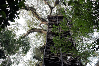 Leaving the canoe behind, we begin our walk. It has not rained for several days—which is unusual—so the path is soft and mostly dry. Thankfully there are no mosquitoes since they don’t breed in black water. We see our first kapok tree, giants of the rainforest that live 300 to 400 years! Angel identifies poison frogs, cacao (chocolate) trees, and walking palms, but the highlight is his discovery of two roasting roosting owls which we view though the telescope he carries and sets up for us. The walk ends at the Sacha Lodge butterfly tent where butterflies are bred and sent around the world.Quiet descends on the rain forest during mid-day. It is time to read, relax, and swim in the lake -- if one is confident in the guides' assurance that caimans and piranha are only active at night! Then at 4:00pm we head back out to visit the "towers" for some bird watching. The lodge has constructed three metal towers that rise above the canopy and are connected by narrow walkways with roped sides. Looking out rather than down is the strategy I use to acclimate to this "bird's-eye view."