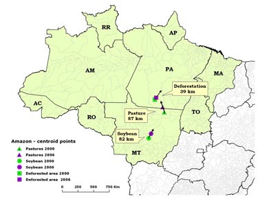 The analysis showed that deforestation shifted 39 km to the northeast between 2000 and 2006, while pasture moved 87 km to the northwest and soybeans shifted 82 km to the northeast.