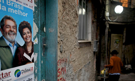 A poster of Brazilian leader Luiz Inácio Lula da Silva with presidential candidate Dilma Rousseff in a Rio de Janeiro favela. Photograph: Natacha Pisarenko/AP